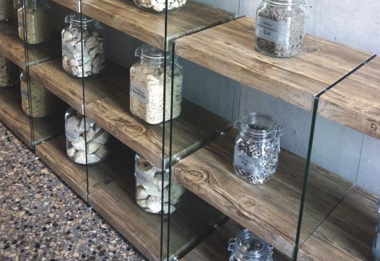 „Wir wollen unser Material zeigen.“ sagte stolz Frau Rebekka Schwentner. Wie in einer Apotheke werden die Schätze in Gläsern, sortiert nach Größe, aufbewahrt. Ernst-Werner Meschenmosers Augen leuchteten als er davon erzählt, dass er mit den Steingemischen aus dem Schotterwerk Ott schon viele hervorragende Terrazzoböden hergestellt hat. Eine Machart, die schon mehr als 3000 Jahre alt ist, und heute wieder zu völlig neuer Bedeutung emporkommt.